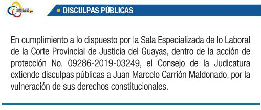 Disculpa Pública: En cumplimiento a lo dispuesto por la Sala Especializada de lo Laboral de la Corte Provincial de Justicia del Guayas, dentro de la acción de protección No. 09286-2019-03249, el Consejo de la Judicatura extiende disculpas públicas a Juan Marcelo Carrión Maldonado, por la vulneración de sus derechos constitucionales.