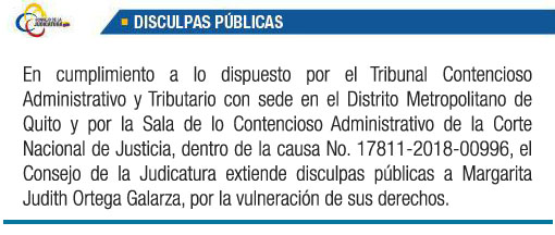 Disculpa Pública:En cumplimiento a lo dispuesto por el Tribunal Contencioso Administrativo y Tributario con sede en el Distrito Metropolitano de Quito y por la Sala de lo Contencioso Administrativo de la Corte Nacional de Justicia, dentro de la causa No. 17811-2018-00996, el Consejo de la Judicatura extiende disculpas públicas a Margarita Judith Ortega Galarza, por la vulneración de sus derechos.