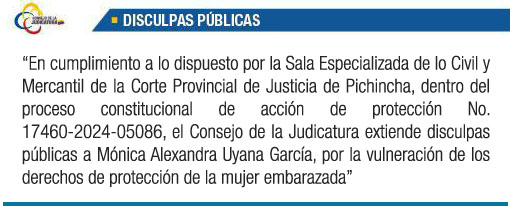 Disculpa Pública: “En cumplimiento a lo dispuesto por la Sala Especializada de lo Civil y Mercantil de la Corte Provincial de Justicia de Pichincha, dentro del proceso constitucional de acción de protección No. 17460-2024-05086, el Consejo de la Judicatura extiende disculpas públicas a Mónica Alexandra Uyana García, por la vulneración de los derechos de protección de la mujer embarazada”