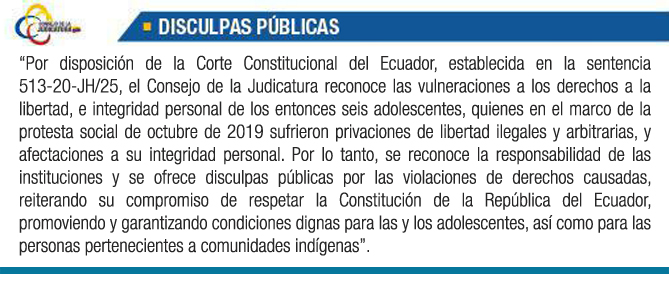 Disculpa Pública: “Por disposición de la Corte Constitucional del Ecuador, establecida en la sentencia 513-20-JH/25, el Consejo de la Judicatura reconoce las vulneraciones a los derechos a la libertad, e integridad personal de los entonces seis adolescentes, quienes en el marco de la protesta social de octubre de 2019 sufrieron privaciones de libertad ilegales y arbitrarias, y afectaciones a su integridad personal. Por lo tanto, se reconoce la responsabilidad de las instituciones y se ofrece disculpas públicas por las violaciones de derechos causadas, reiterando su compromiso de respetar la Constitución de la República del Ecuador, promoviendo y garantizando condiciones dignas para las y los adolescentes, así como para las personas pertenecientes a comunidades indígenas”