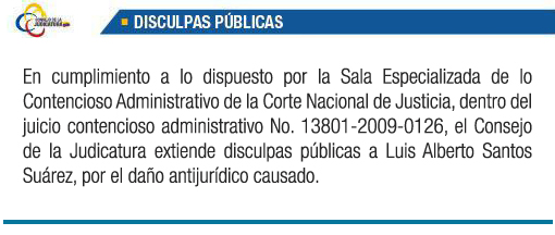 Disculpa Pública: En cumplimiento a lo dispuesto por la Sala Especializada de lo Contencioso Administrativo de la Corte Nacional de Justicia, dentro del juicio contencioso administrativo No. 13801-2009-0126, el Consejo de la Judicatura extiende disculpas públicas a Luis Alberto Santos Suárez, por el daño antijurídico causado.
