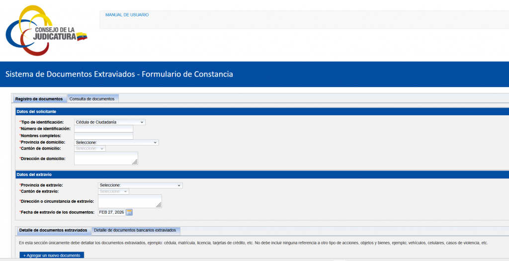 Este servicio gratuito y en línea permite reportar de forma inmediata el extravío o robo de documentos, generando un comprobante oficial. El trámite se realiza a través de la web institucional www.funcionjudicial.gob.ec, sin necesidad de acudir a oficinas judiciales.